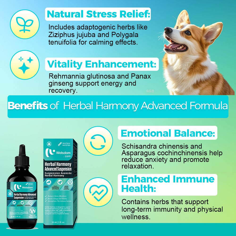 Herbal Harmony Advanced Formula is a liquid dietary supplement crafted to support the overall well-being of cats and dogs. This formula blends traditional herbal extracts known for their synergistic effects on stress relief, vitality enhancement, and immune support. With a palatable liquid form, it is easy to administer and is designed to promote a balanced and healthy life for your pets.
